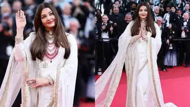 ऐश्वर्या राय बच्चन ने मशहूर डिजाइनर मनीष मल्होत्रा द्वारा डिजाइन की गई सफेद आइवरी बनारसी साड़ी पहनी है। इसके साथ ही उन्होंने लाल रंग का जेड नेकलेस कैरी किया है जो उन्हें रॉयल टच दे रहा है। मैचिंग इयररिंग्स, हाथों में बड़ी सी रिंग के साथ मांग में सिंदूर की एक बोल्ड लकीर है। उन्होंने मांग में सिंदूर भरते हुए अपने बाल खुले रखे हैं। इसके अलावा न्यूड मेकअप भी किया गया है। साड़ी और फुल स्लीव्स ब्लाउज के साथ एक्ट्रेस ने मैचिंग दुपट्टे से अपने लुक को पूरा किया है।