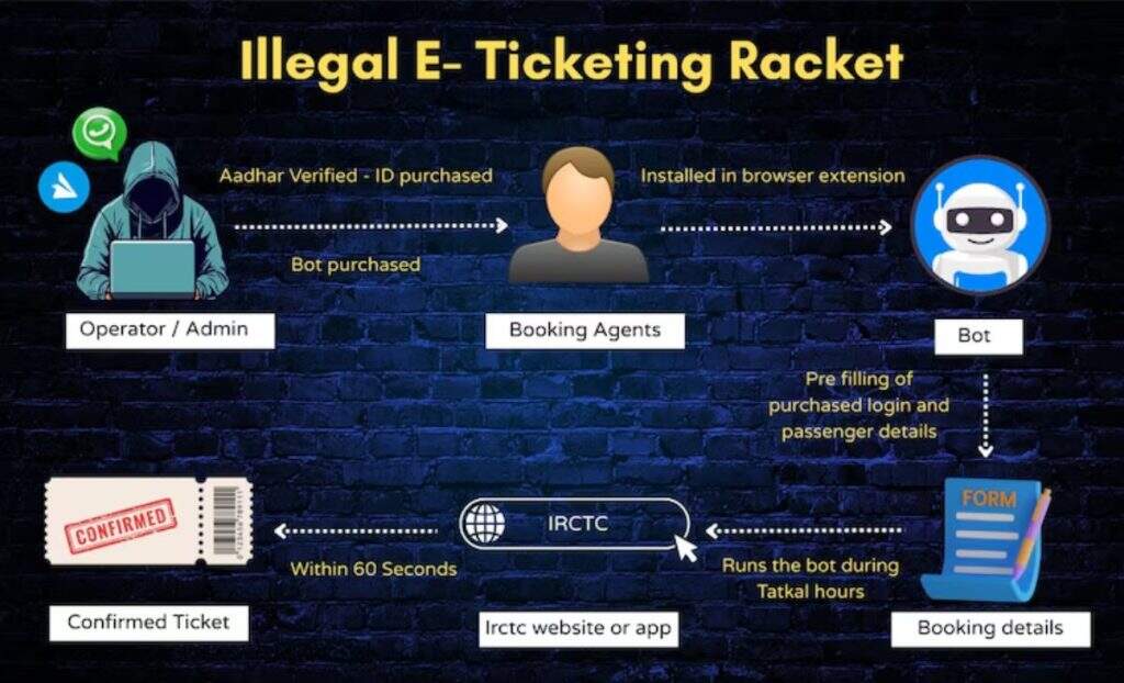 भारतीय रेलवे के तत्काल टिकट आमतौर पर बॉट्स या एजेंट्स द्वारा खरीदे जाते हैं, जिससे यात्रियों को असुविधा होती है। तत्काल टिकट यात्रा शुरू होने से एक दिन पहले बुक किए जाते हैं और 24 घंटे पहले जारी किए जाते हैं। OSINT टीम ने टेलीग्राम और वॉट्सऐप पर सक्रिय 40 से अधिक समूहों के एक नेटवर्क की पहचान की है, जो ई-टिकटिंग के बड़े ऑनलाइन ब्लैक मार्केट का एक छोटा सा हिस्सा है। यहां हजारों एजेंट सक्रिय हैं और सरकारी नियमन के बावजूद इनका धंधा धड़ल्ले से चल रहा है। रेल मंत्रालय ने 1 जुलाई को तत्काल टिकट से जुड़ा नया नियम लागू किया है, जिसके मुताबिक रेलवे के तत्काल टिकट सिर्फ IRCTC की वेबसाइट और उसके एप्लीकेशन के जरिए ही बुक किए जा सकेंगे। खास बात यह है कि इसके लिए यूजर को अपने अकाउंट से आधार कार्ड लिंक करना जरूरी कर दिया गया है। मंत्रालय की घोषणा के तुरंत बाद ही सोशल मीडिया पर ई-टिकट से जुड़े रैकेट ने धांधली शुरू कर दी है। वे आधार वेरिफाइड आईडी और ओटीपी बेच रहे हैं।