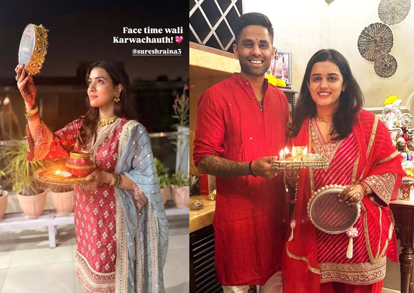 शुक्रवार रात पूरे देश में करवा चौथ का त्यौहार बड़े हर्षोल्लास और उत्साह के साथ मनाया गया। आम लोगों से लेकर मशहूर हस्तियों तक, हर कोई इस त्यौहार में डूबा हुआ दिखाई दिया। कुछ क्रिकेटरों और उनकी पत्नियों ने सोशल मीडिया पर करवा चौथ मनाते हुए अपनी तस्वीरें पोस्ट कीं। सोशल मीडिया पर सबसे ज़्यादा चर्चा भारतीय टी20 कप्तान सूर्यकुमार यादव की हो रही है, जिनकी करवा चौथ मनाते हुए तस्वीरें वायरल हो रही हैं। क्रिकेट प्रशंसक इन तस्वीरों पर उत्साहजनक प्रतिक्रिया दे रहे हैं।