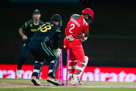 मैच से पहले ऑस्ट्रेलिया को हराने का दावा करने वाली ओमान की टीम टॉस गंवाकर जब पहले बल्लेबाजी करने उतरी तो ऑस्ट्रेलियाई गेंदबाजों के सामने उसके बल्लेबाजों के पांव कांपते नजर आए। शून्य के स्कोर पर पहला विकेट खोने वाली ओमान ने लगातार विकेट खोए और पूरी टीम 16.2 ओवर में 104 रन पर सिमट गई।