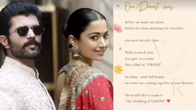 रश्मिका और विजय दोनों ने अपने सोशल मीडिया अकाउंट पर एक स्पेशल पोस्ट शेयर किया, जिसमें उन्होंने अपनी शादी का नाम “VIROSH की शादी” रखा। पोस्ट में यह भी बताया गया है कि उन्होंने यह नाम क्यों चुना। पोस्ट में उन्होंने लिखा, “हमारे प्यारे फैंस, जब हमने कुछ भी प्लान नहीं किया था, जब हमने अपने लिए कुछ भी तय नहीं किया था, तब आप हमारे साथ थे। इतने प्यार से, आपने हमें एक नाम दिया। आपने हमें ‘VIROSH’ कहा।”